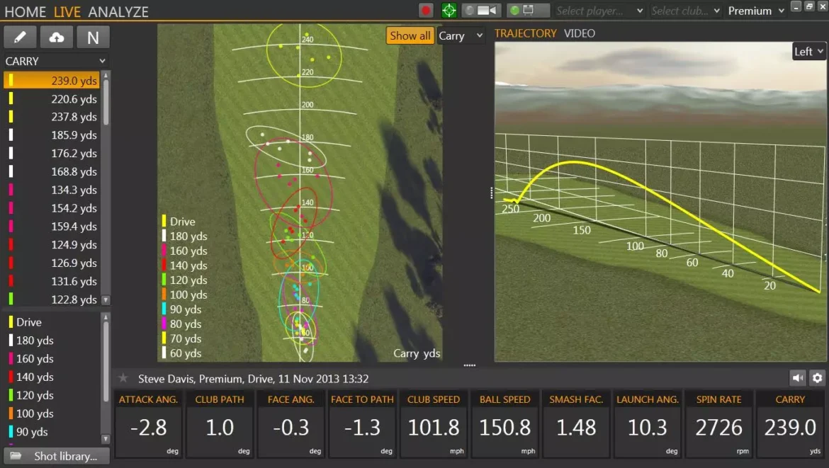 Ale do rzeczy, górna naklejka pokazuje uderzenia kijem, z którym chłopak do mnie przyszedł 7i 36,5 cala długości. Na poczekaniu zdjąłem grip z jego siódemki i ją prowizorycznie przedłużyłem na 37 cali zakładając grip z powrotem. Młodemu się spodobało, mi się podobało, naklejka też ładna, ta w środku. Poprosił o przedłużenie o następne pół cala, nie byłem przekonany co do sensu, ale weź się kłuć z czternastolatkiem. A proszę Cię małolat bardzo. 3 minuty później 7i długie na 37,5 cala ląduje w rękach delikwenta. Wynik pokazuje dolna naklejka, powiedzmy, że jest akceptowalny. Małolat już zaczynał liczyć dodatkowe metry wynikające z dłuższego o cal kija, ale sprowadziłem go na ziemię. Poczekaj chłopaku z tym kalkulatorem dopóki nie uderzysz 5 iron o cal dłuższym. Powtórzyliśmy procedurę siódemki dla 5 i. I co się okazało ? A no, ze małolat napalony na longest drive, wobec bezdyskusyjnych dowodów na naklejkach (zdjęcie poniżej)i na moim GC2 ForeSight sam poprosił o krótszą przedłużkę. Często mniej znaczy więcej.